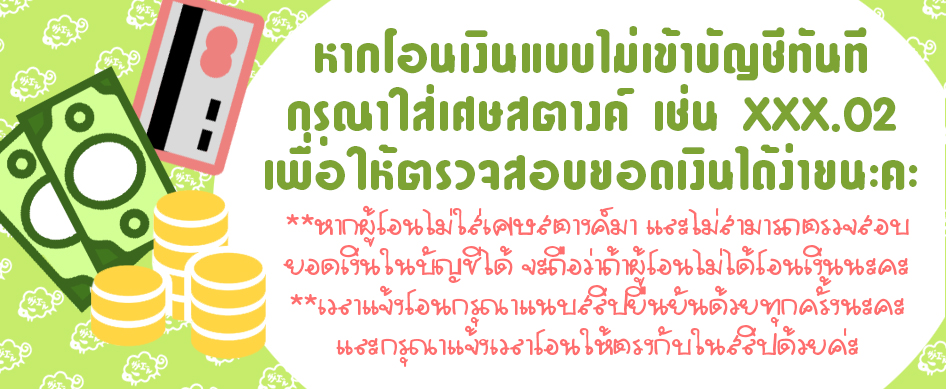*หากโอนแล้ว แต่ใบสั่งซื้อหมดอายุ สามารถขอต่ออายุใบสั่งซื้อได้ โดยติดต่อที่อีเมลล์ zanasheep@hotmail.com หรือ Facebook: zanasheep นะคะ